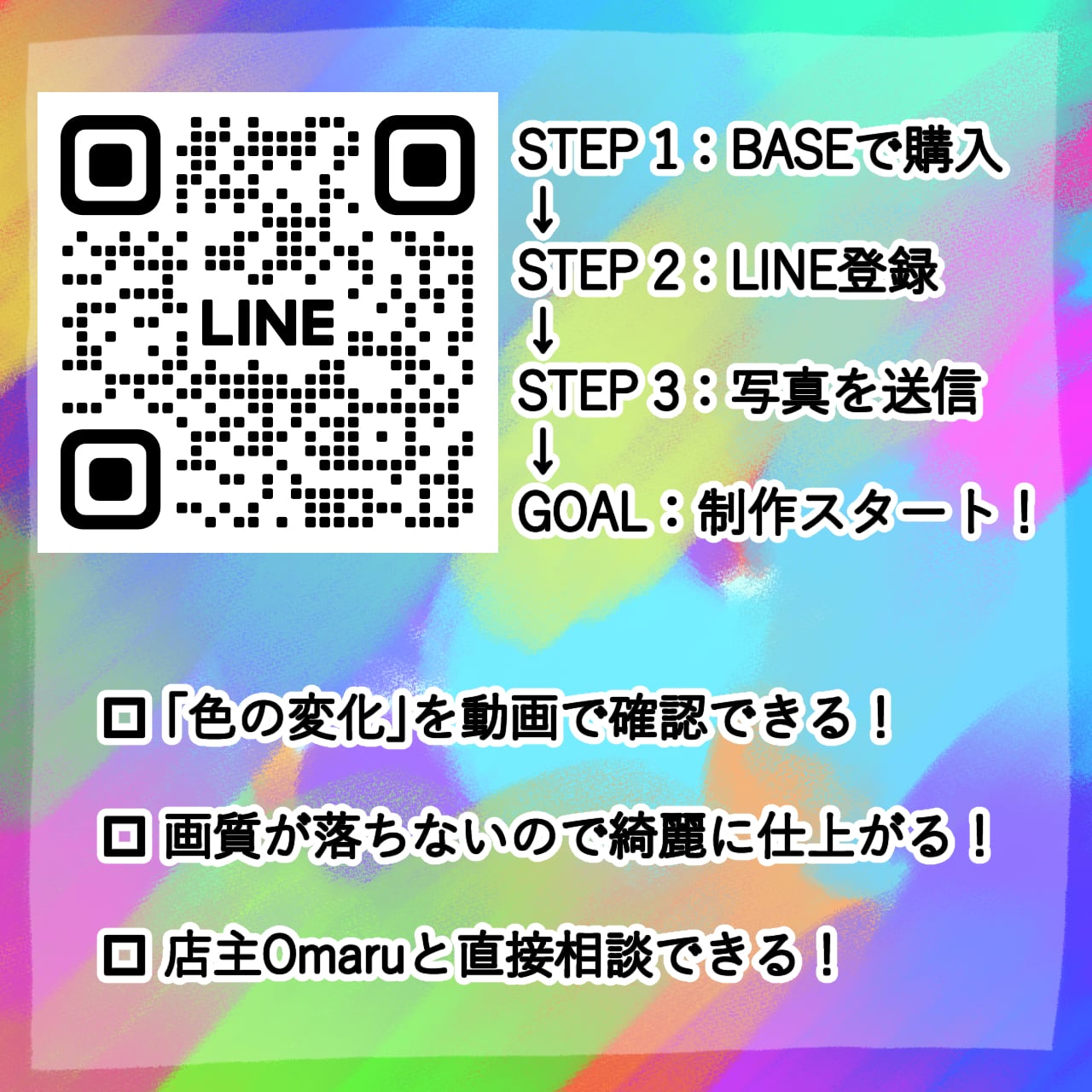以下のURLより友だち追加を行い、チャット画面にて「ご注文時のお名前」を送信してください。お写真のやり取りが最もスムーズに行えます。