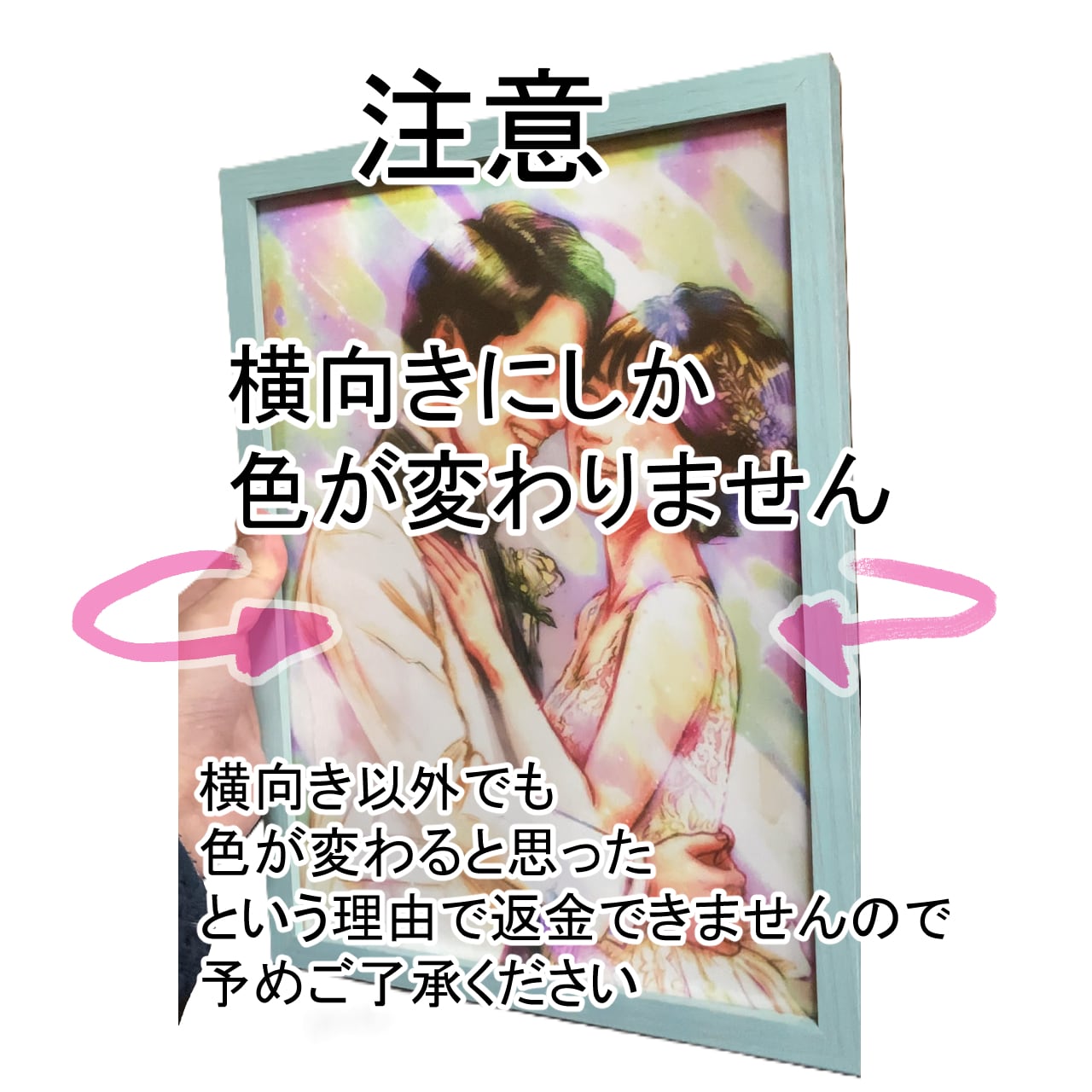 本作品はレンチキュラーの特性上、左右(横方向)に動かした時のみ色や絵柄が変化します。縦方向の変化はありませんのでご注意ください。